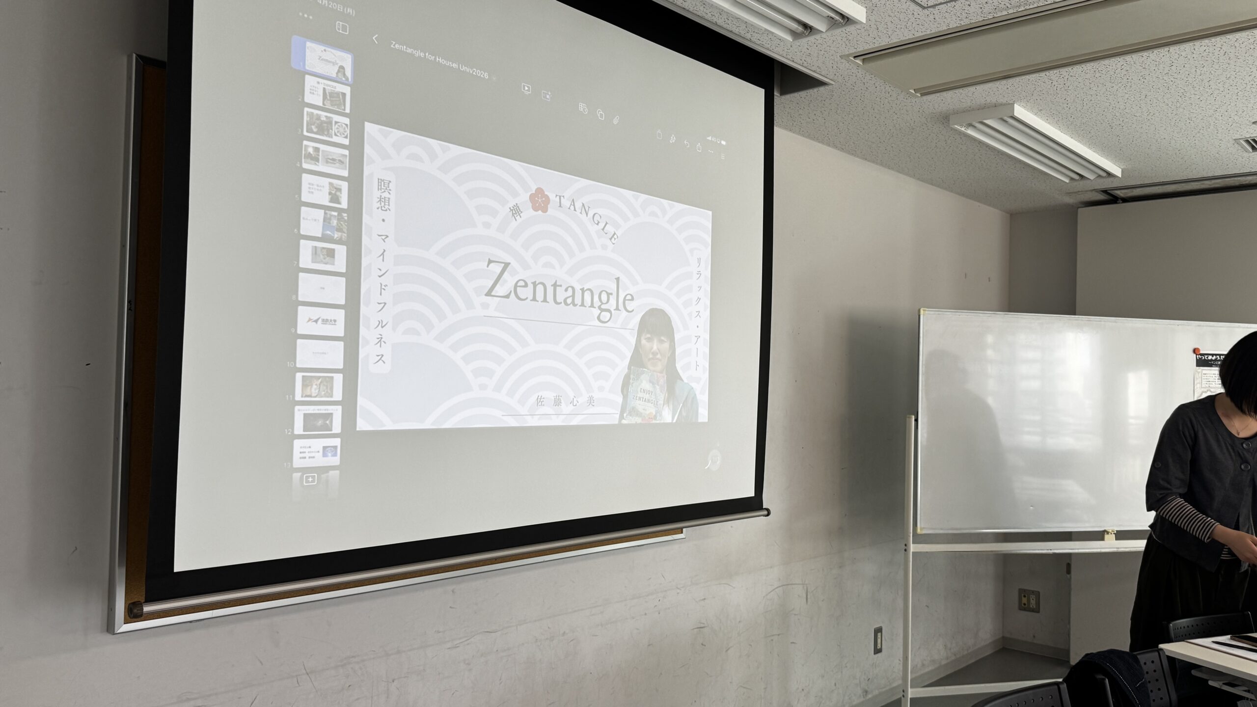 2025年4月20日、ご縁をいただき法政大学市ヶ谷キャンパスにて、講師としてゼンタングルの講座を開催させていただきました。学生の皆さんがファシリテーターとなり、前半は『禅の瞑想としてのゼンタングル』についての講義を、後半で実際にペンを持ち、描く体験をしていただきました。